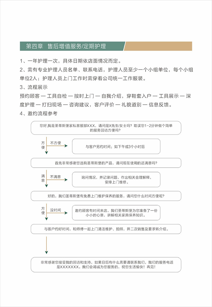 话术参考:“**先生/女士您好,我是圣蒂斯堡的售后服务人员**,您购买的圣蒂斯堡家具已经全部到货了,送货安装大约需要**时间,请问您这边什么时候方便我们上门送货安装呢?”同时要了解送货小区的电梯、楼道、入户门的尺寸等,提前做好准备,避免意外情况。最后确定送货时间(安装所需要时长),并告知客户安装人员的相关信息,可加微信发送,并发送配送安装流程说明。