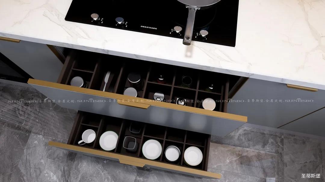 厨房是独属我的一片小天地,设计师充分利用了材质特性,定制高柜,根据我的用厨习惯进行收纳区域划分,极简大气的外部结构实则蕴藏着超乎想象的大收纳空间。